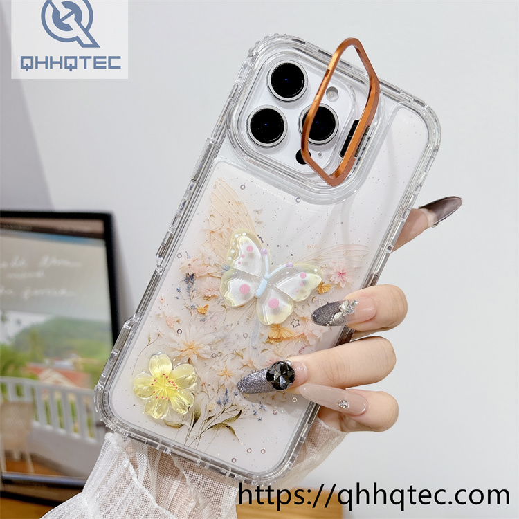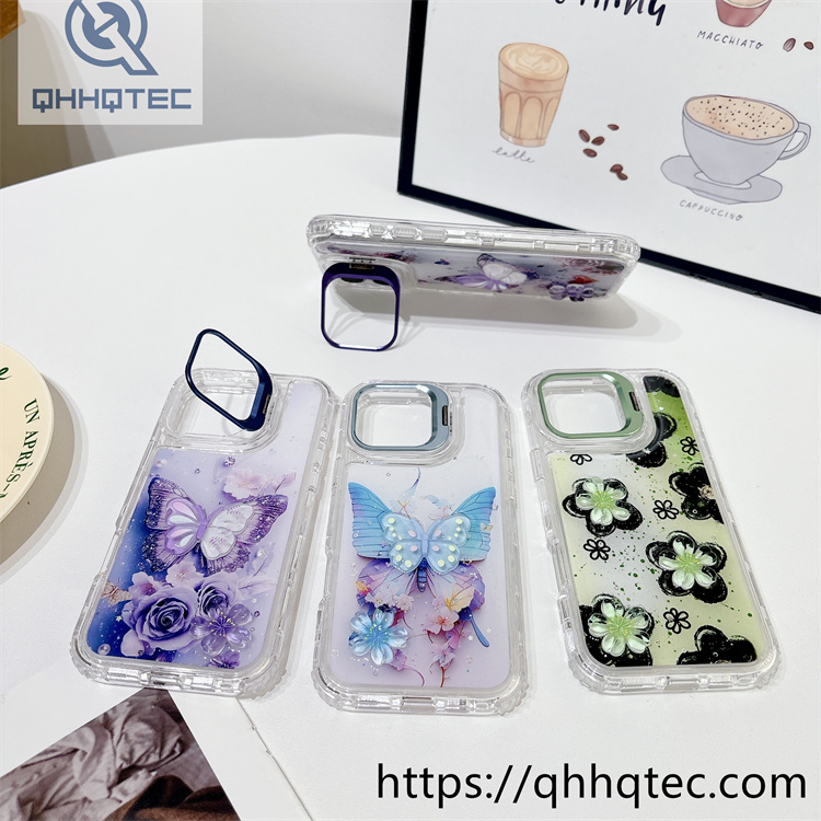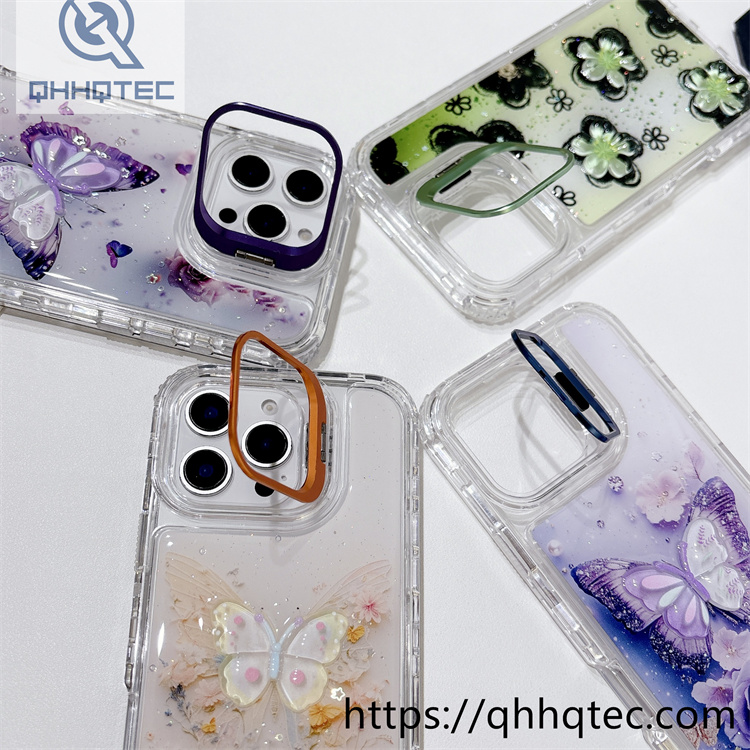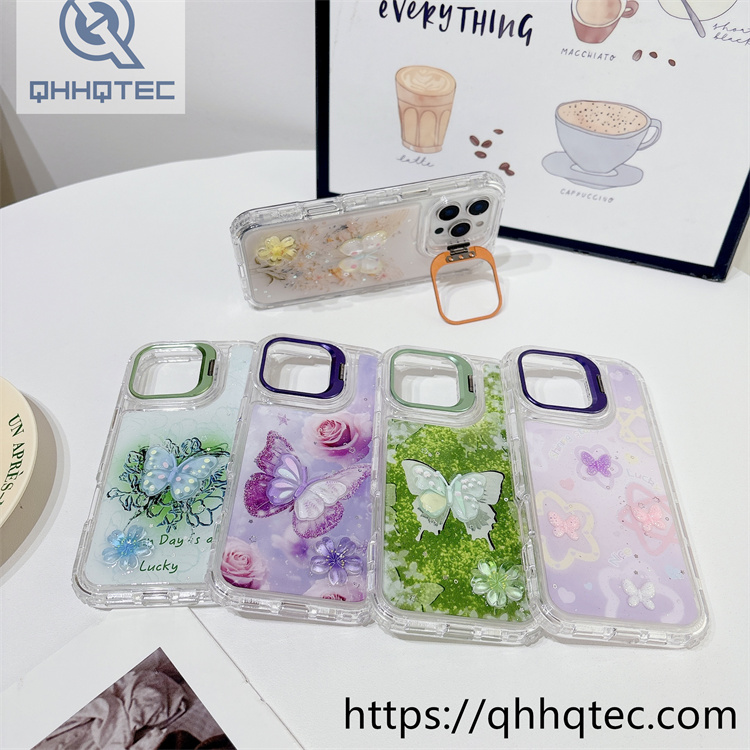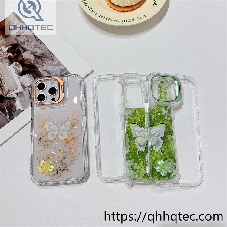 subtitle: Ethereal butterflies patterns flowers ornament phone 3 in 1 case dripping design metal len bracket