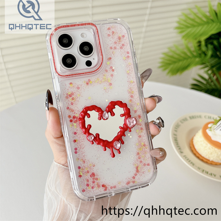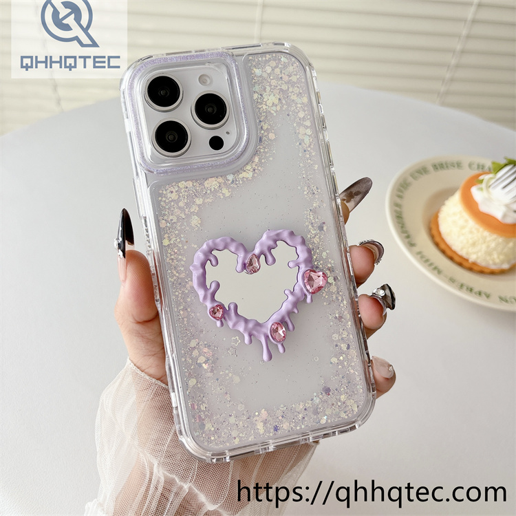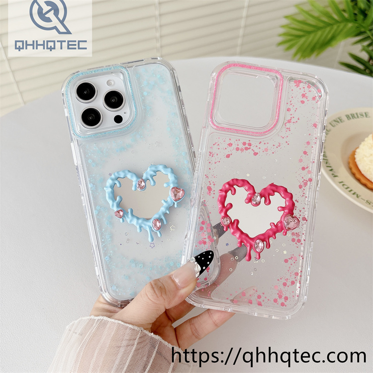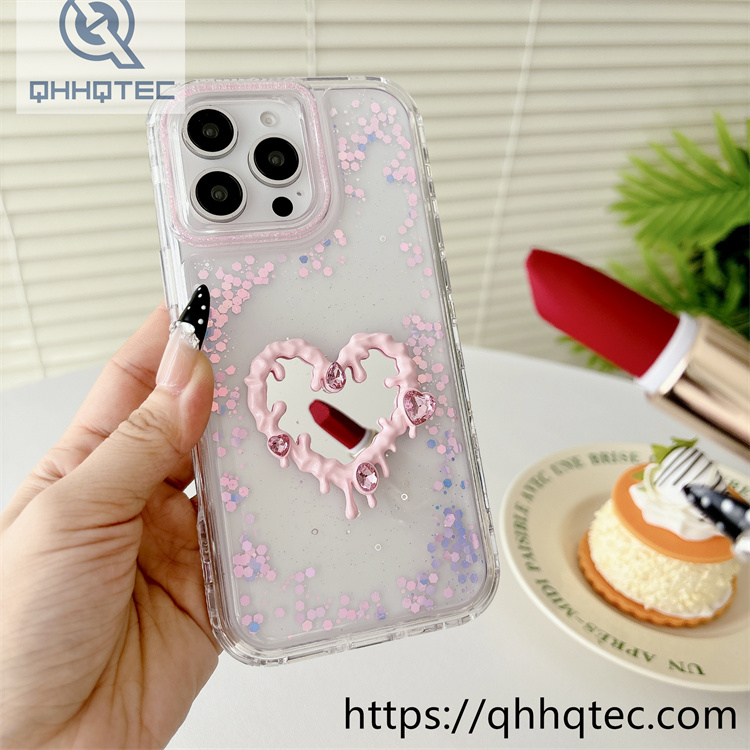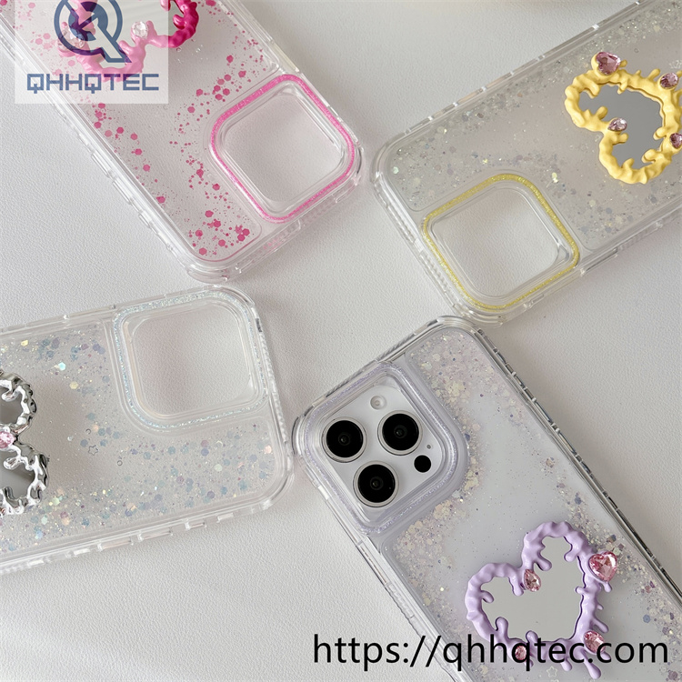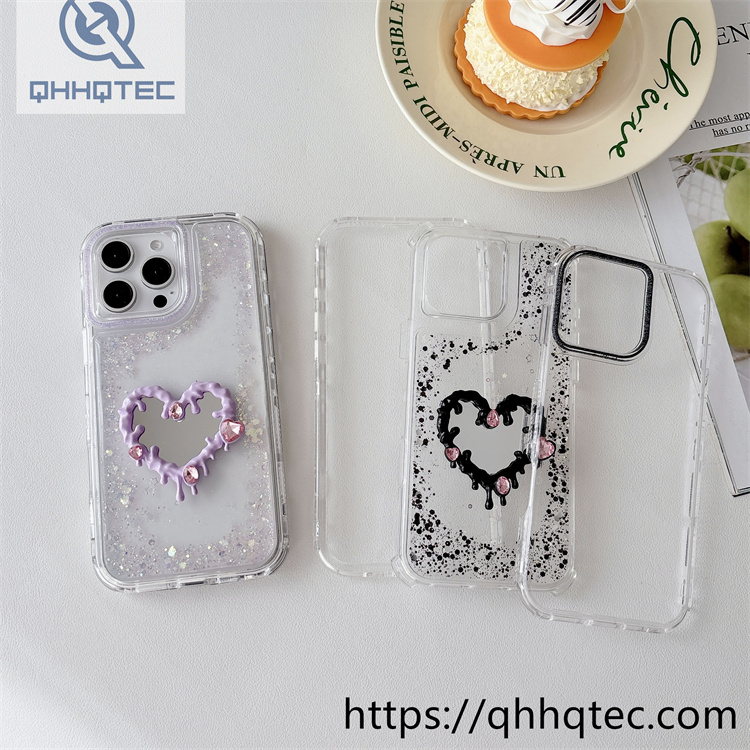 subtitle: Glitter sequins decoration transparent heart shape diamonds mirror make up girl 3 in 1 phone case
