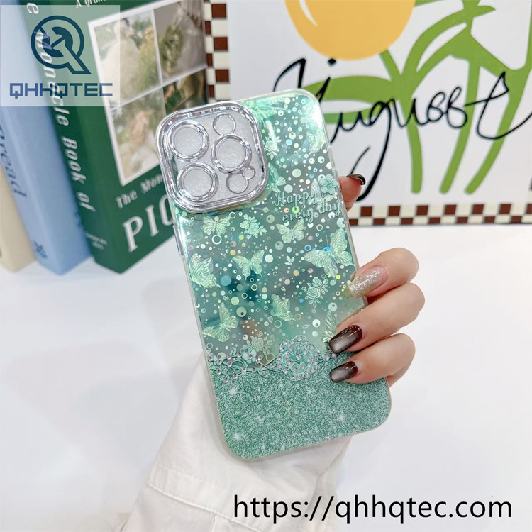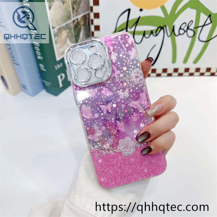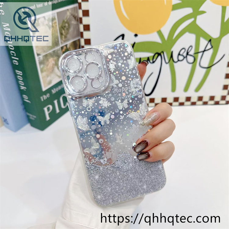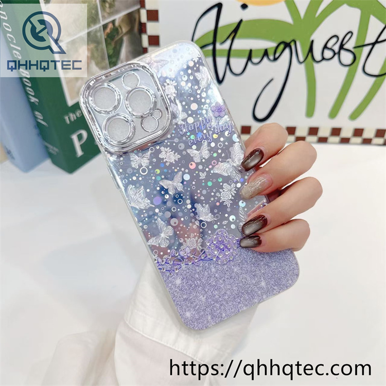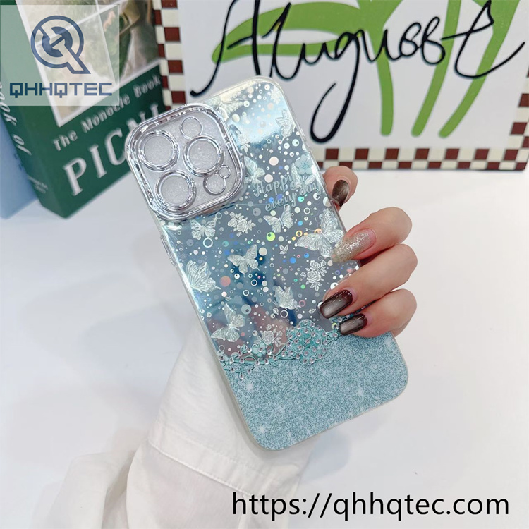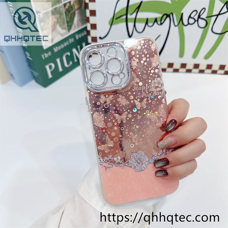 subtitle: Glitter lacework plicing design laser light phone case flowers butterfly patterns plating camera frame