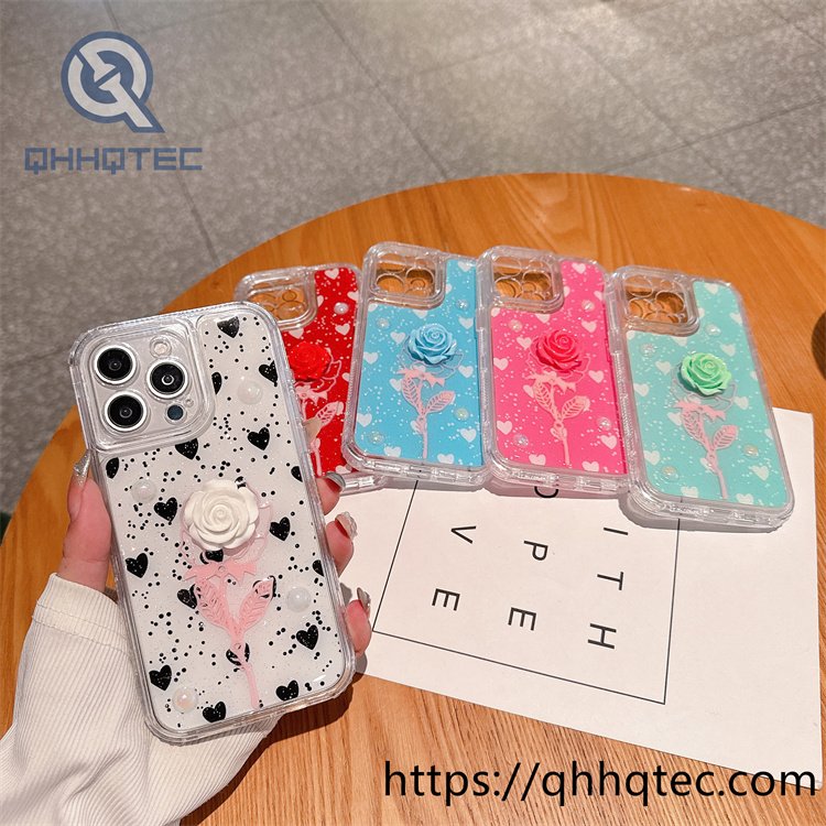 subtitle: Heart pattern with 3D rose flower 3 in 1 phone case camera pack protect design pearl decoration