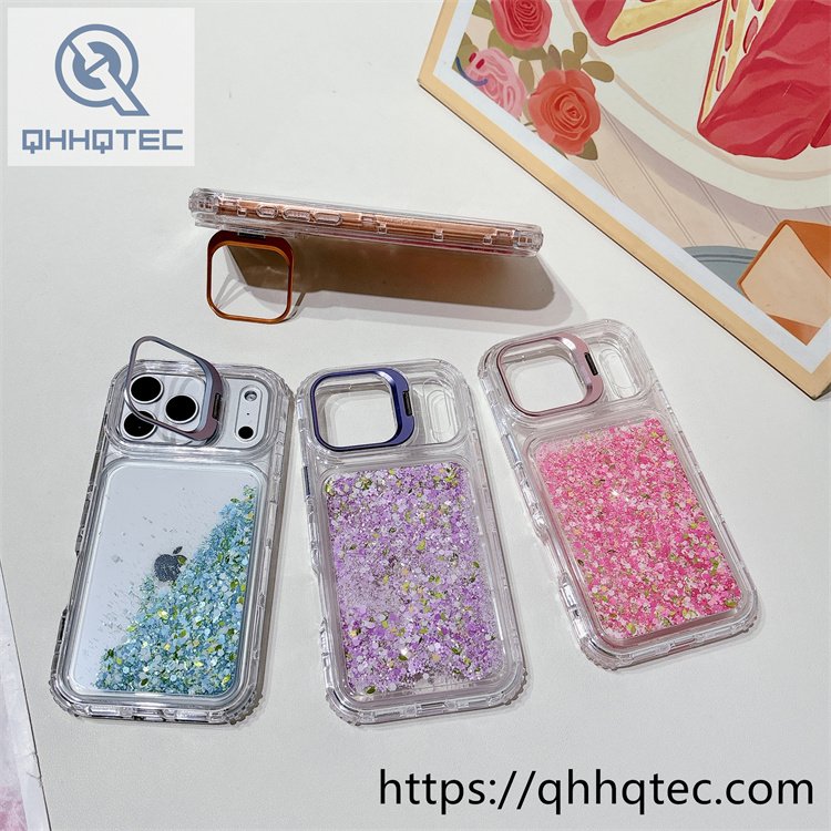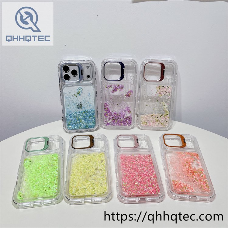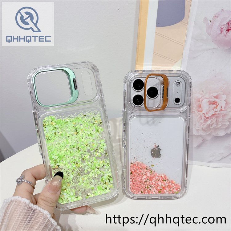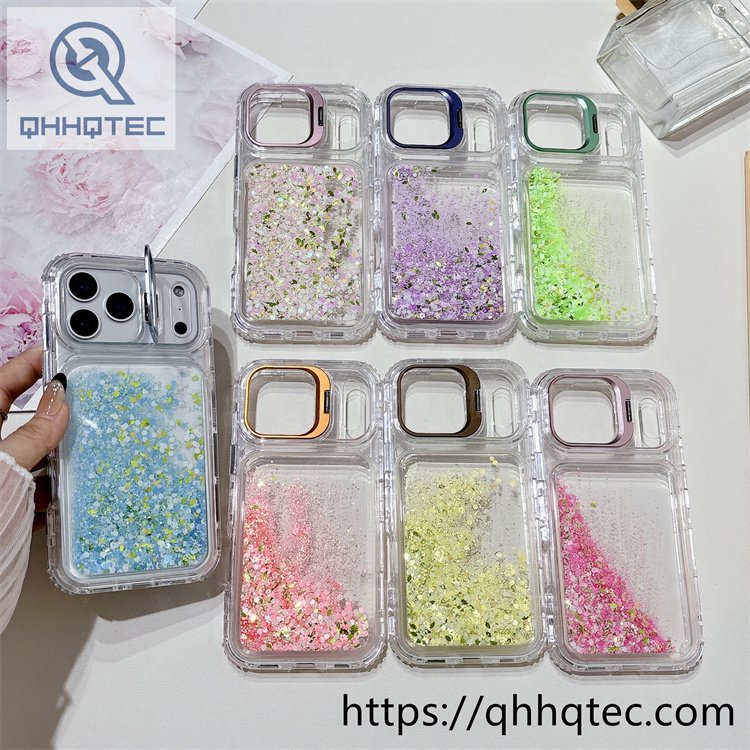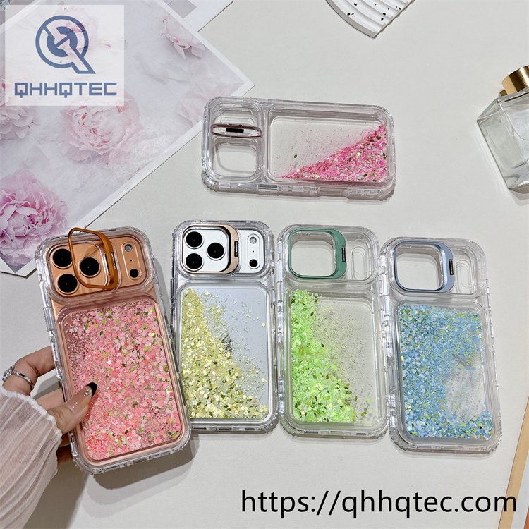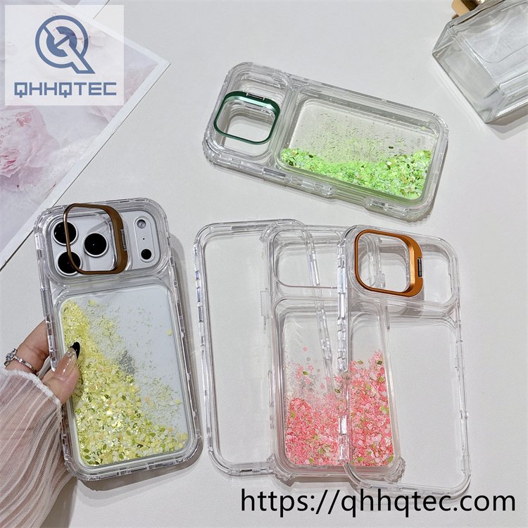 subtitle: Glitter quicksand back panel design 3 in 1 cover metal len bracket transparent frame clear case